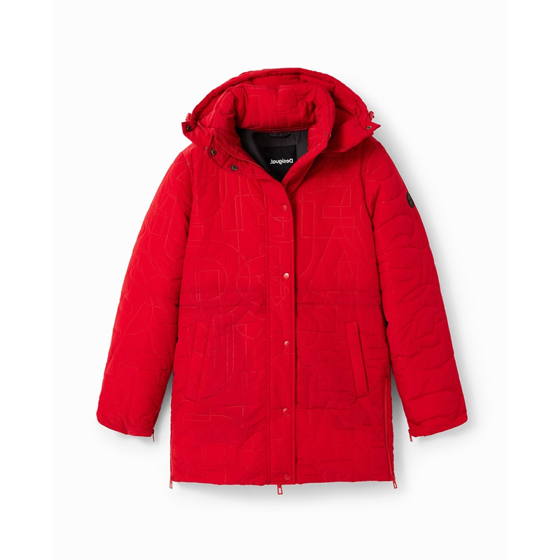 Lange gepolsterte Jacke mit abnehmbarer Kapuze, unter Reißverschluss und Ärmeln und lyrischem Design.