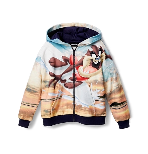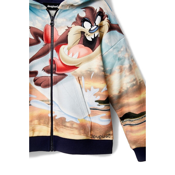 El Demonio de Tasmania protagoniza esta chaqueta de felpa con capucha y cremallera. En la espalda, el Pato Lucas y el Correcaminos escapan de su enemigo en un paisaje desértico.