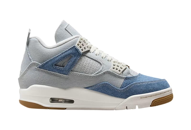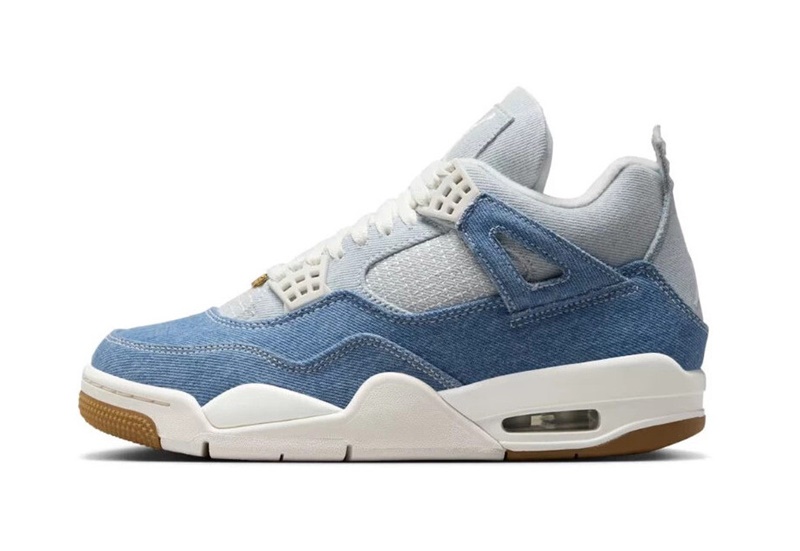 The Jordan 4 Denim Worn Blue stands out thanks to its 100% denim fabric. It features light gray and blue jeans. The word "Family," embossed gold logos, and a touch of bubblegum brown complete the look. Inspired by the Air Jordan 1 High Denim, released in 2022, this silhouette adapts to all styles, creating a trendy streetwear look.