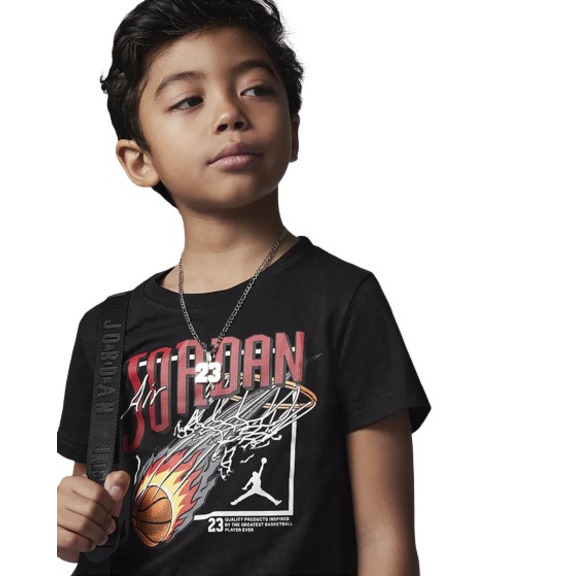 Kleine Basketball-Spieler können die Flight-Marke mit diesem Satz von zwei Spielfiguren, gebildet durch ein weiches knit Stoff-Shirt mit Grafiken, die weich auf der Haut fühlt und koordinierte atmungsaktive Netz Shorts, die das Tempo des Spiels folgen, um leicht zu kleiden Kinder im Jumpman-Stil.