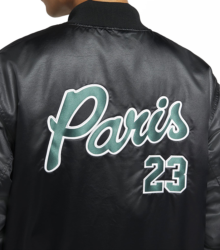 Das Design der Jacke umfasst Patches, die die exklusive Zusammenarbeit zwischen Jordan und Paris Saint-Germain hervorheben. Ein runder Paris-Patch schmückt die Brust, während auf der Rückseite sind Paris-Patches und Nummer 23, ein Detail, das sich auf die ikonische Michael Jordan Figur bezieht.