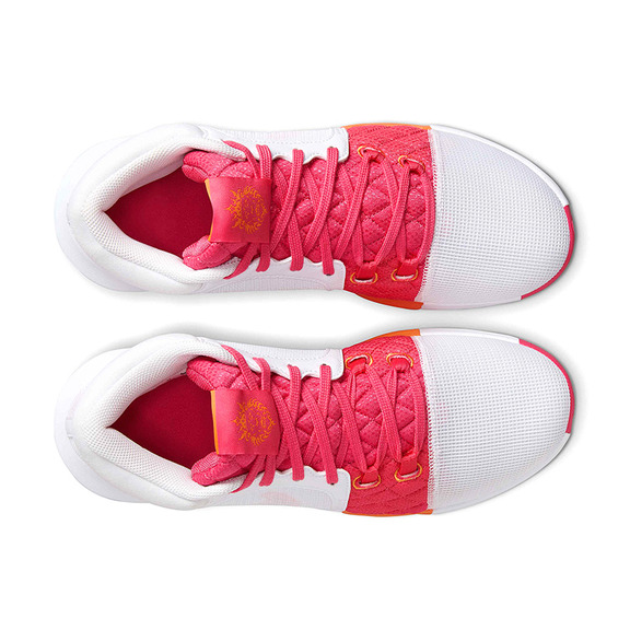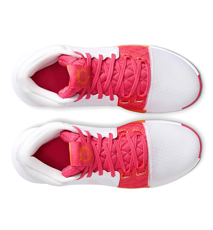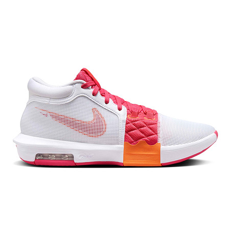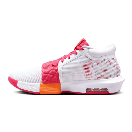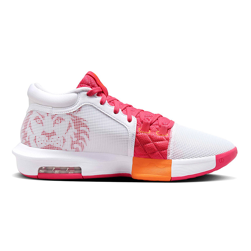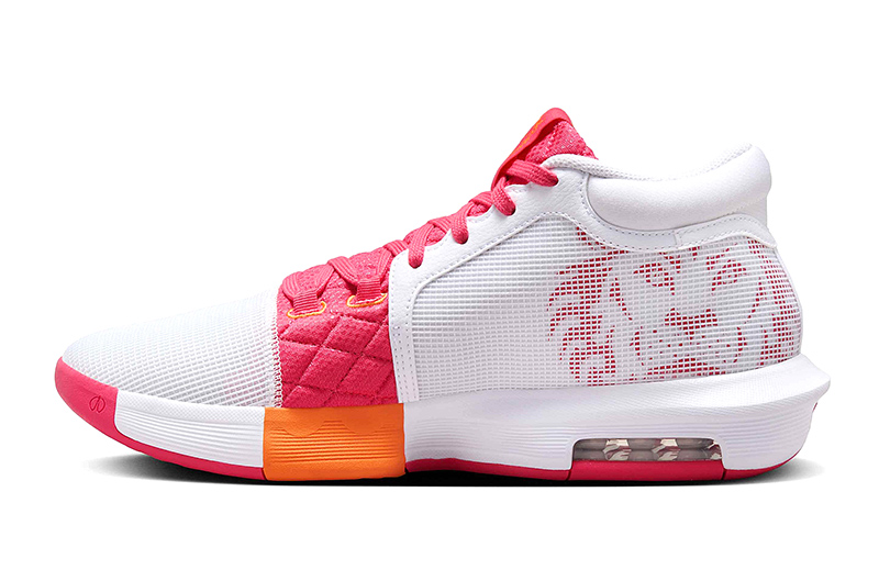 Die LeBron Witness 8 "White/Aster Pink" zeichnet sich durch ihre Kombination aus leuchtenden Farben und aerodynamischem Design aus, das nicht unbemerkt bleibt. Die Verschmelzung zwischen weißem, rosa und hellem Mandarin schafft einen markanten Kontrast, der die Persönlichkeit und Stärke von LeBron James in jedem Detail widerspiegelt.
