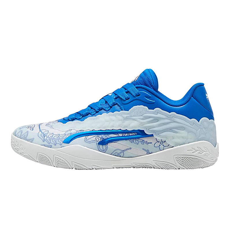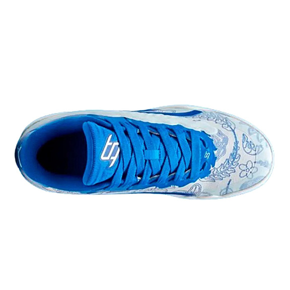 Dieser nächste Schuh ist eine Fusion aus innovativem Design und persönlichem Stil, die in seinen komplizierten Details deutlich wird. Die Puma Stewie 3 "Paris" bietet eine fesselnde Mischung aus blau und weiß, mit der Spitze verziert mit floralen Elementen, die eine markante Note hinzufügen. Ein bemerkenswertes Merkmal ist das TPU-Panel, das sich elegant von der Ferse bis zur Spitze erstreckt, kombiniert mit einer weißen Basisschicht, die mit einem blauen Blumendruck geschmückt ist.